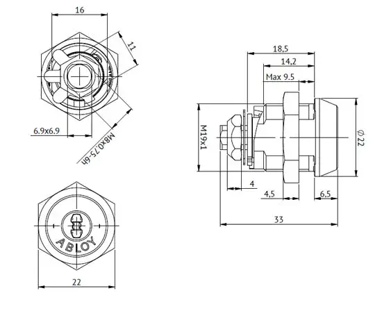 Key removable in locked position. Max Door Thickness 9.5mm.